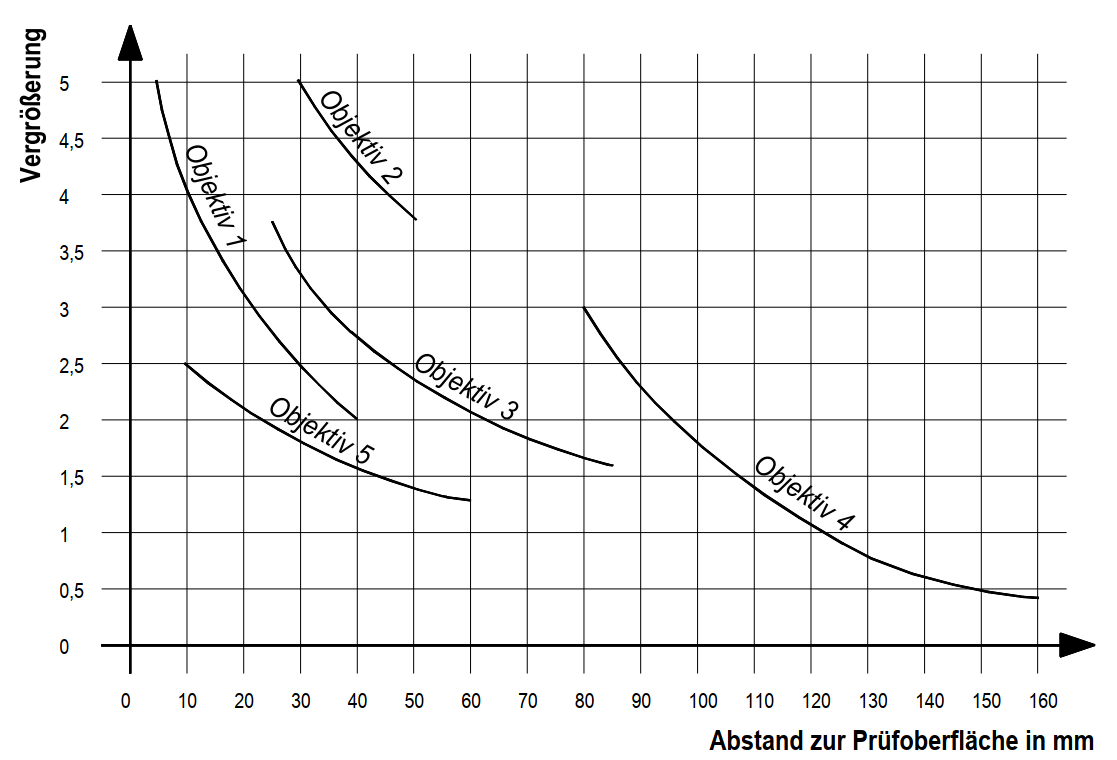 Welche Vergrößerung wird mit Objektiv 1 bei einem Abstand von 10 mm bis 40 mm erreicht?